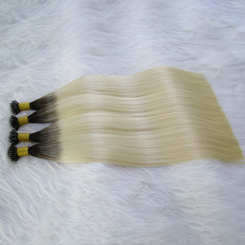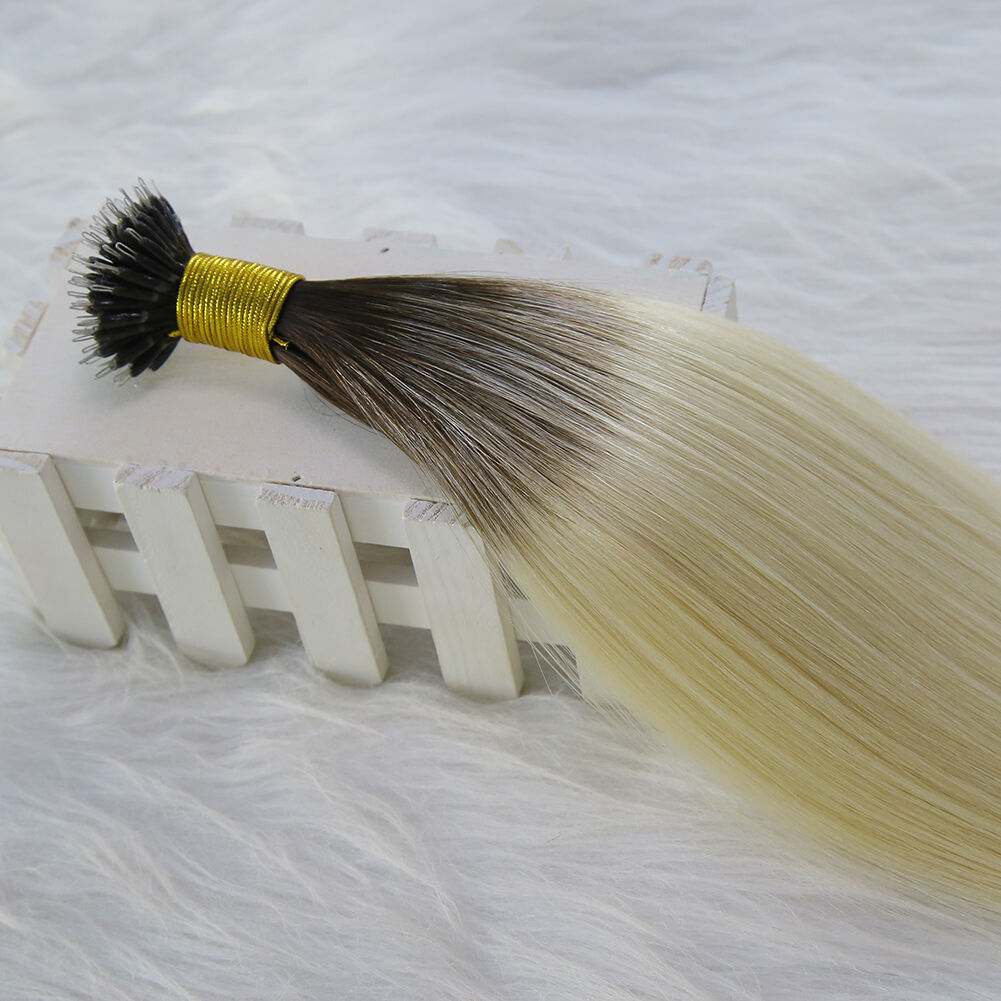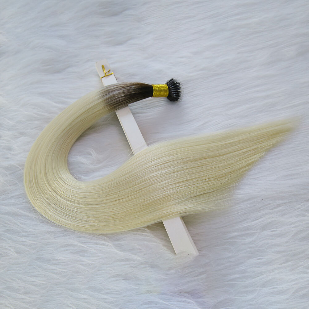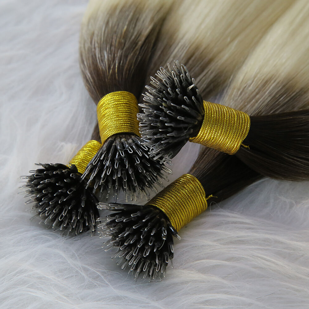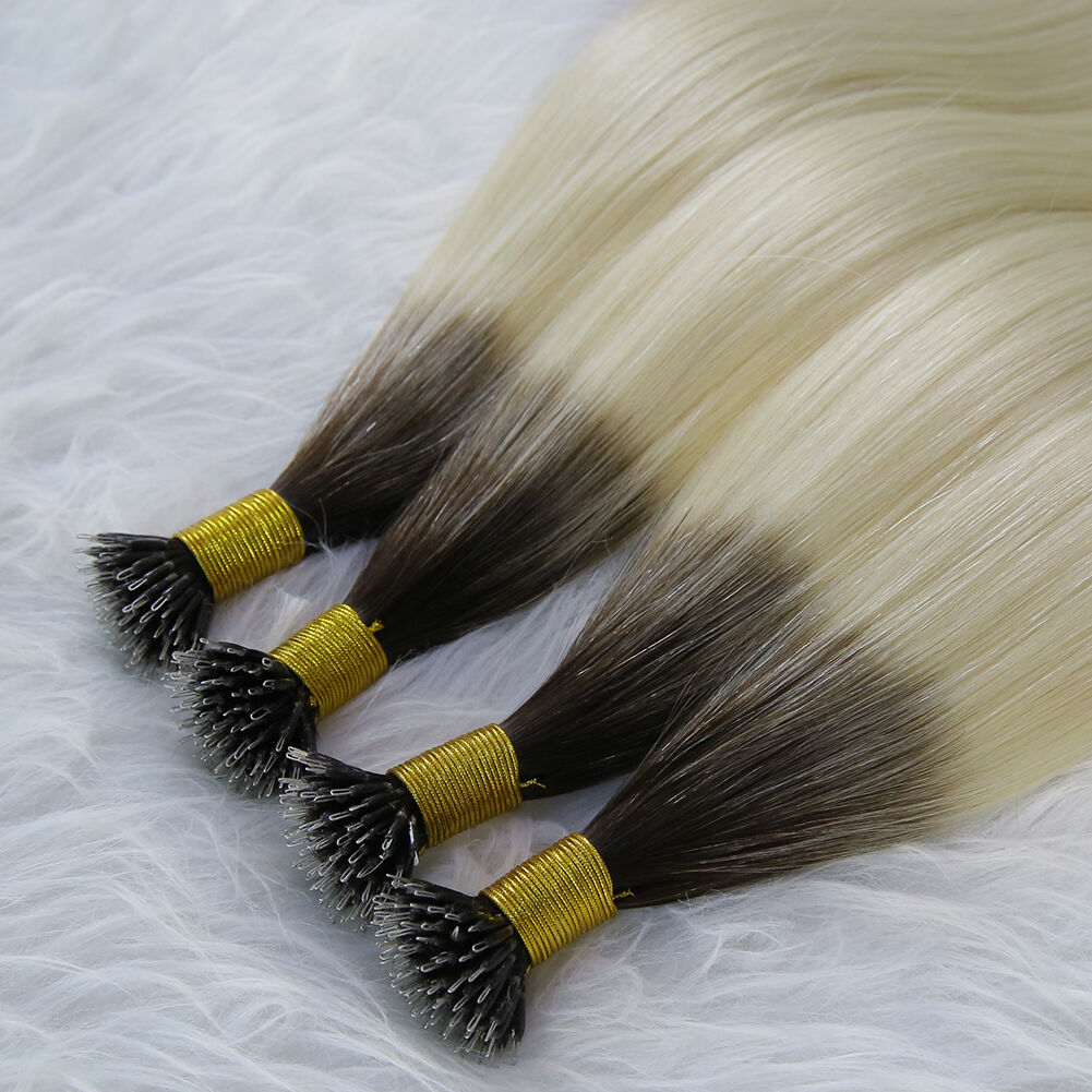 As a leading manufacturer of hair extensions, we are excited to present our 22-inch nano ring hair extensions. These extensions showcase a seamless gradient transitioning from #3 dark brown to #60 light blonde. The nano ring hair extension is made from 100% premium virgin human hair, which maintains intact cuticles, providing a silky texture and natural shine that resembles healthy human hair. The gradient color is expertly hand-blended by our skilled colorists, guaranteeing smooth transitions without any harsh color blocks.
